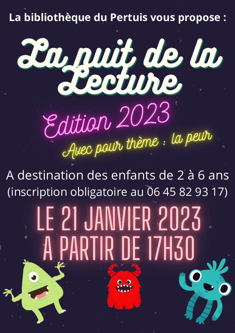 Samedi 21 janvier à 17h30, les bénévoles de la Bibliothèque organise "la Nuit de la Lecture 2023" sur le thème de LA PEUR, pour les enfants de 2 à 6 ans