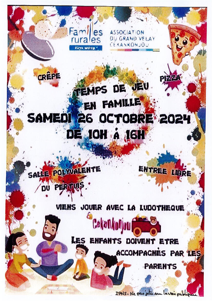 Samedi 26 octobre la ludothèque CEKANKONJOU vous accueille à la salle polyvalente du Pertuis de 10h à 16h pour un temps de jeux en famille