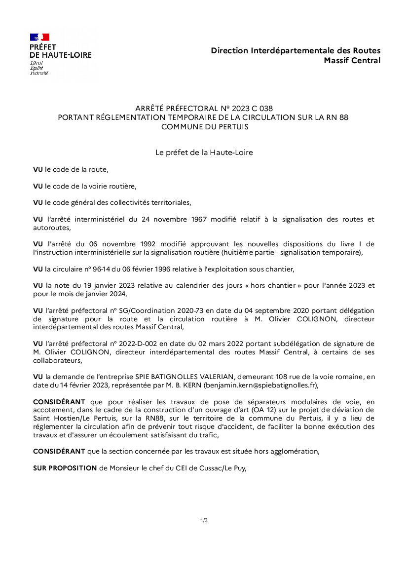 Arrêté réglementant temporairement la circulation sur RN88