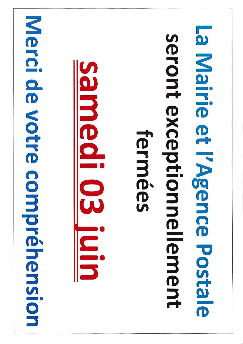 Fermeture exceptionnelle de la Mairie et de la Poste samedi 3 juin