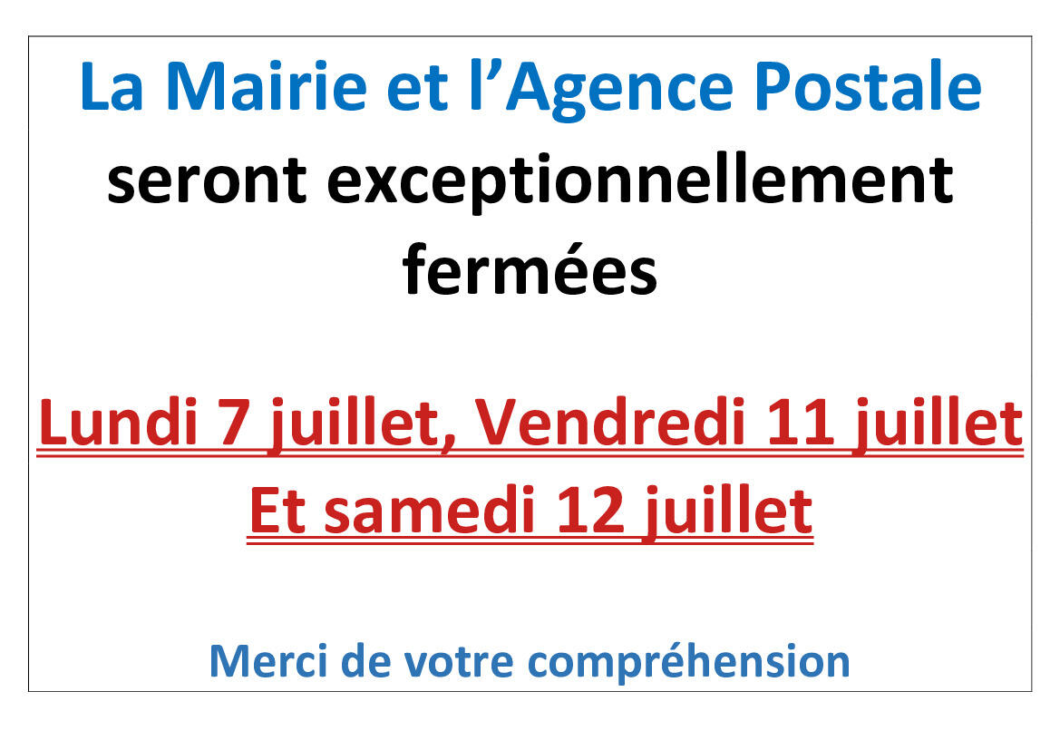 Fermeture exceptionnelle de la Mairie et de la Poste lundi 7 juillet, vendredi 11 juillet et samedi 12 juillet