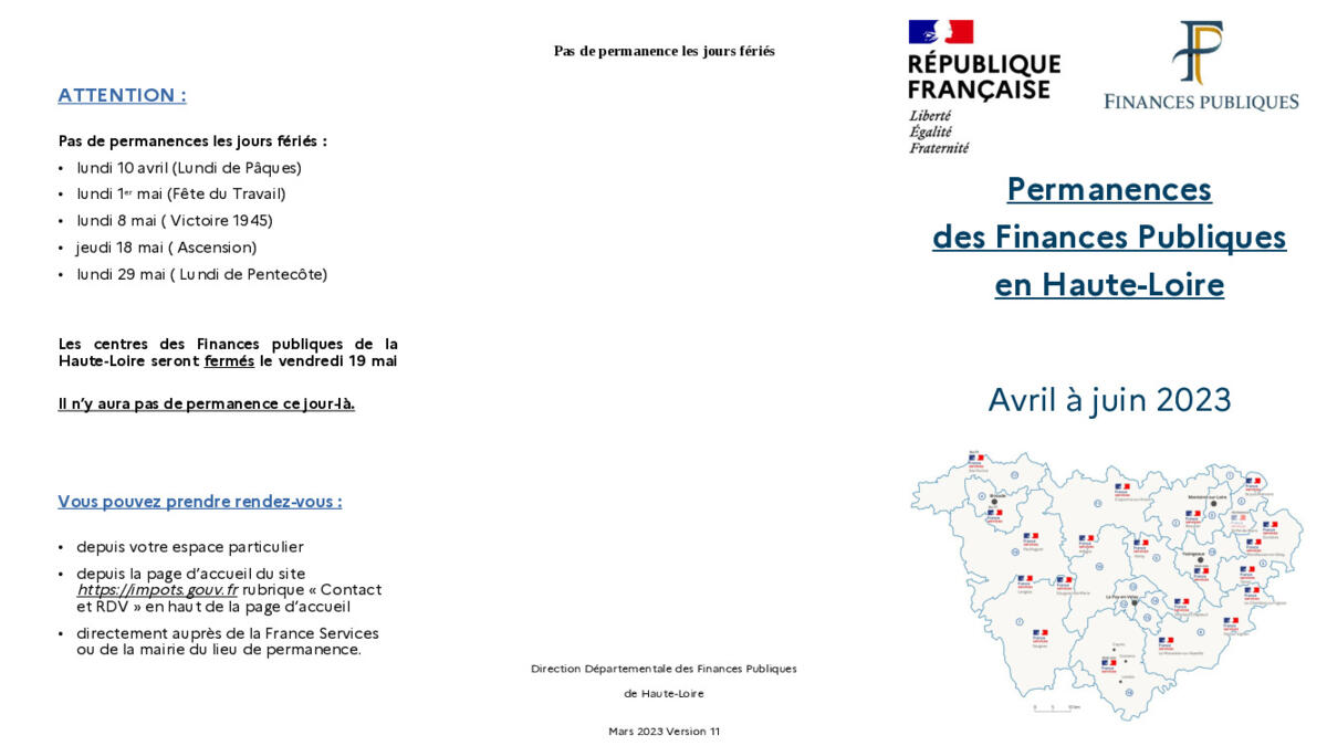 Au niveau départemental, les agents de la Direction Départementale des Finances Publiques sont présents, au plus près des usagers, dans 19 établissements "France Services" et 5 Mairies en plus des accueils sur les 4 centres des Finances (Le Puy-Terrasson / Brioude / Yssingeaux / Monistrol).