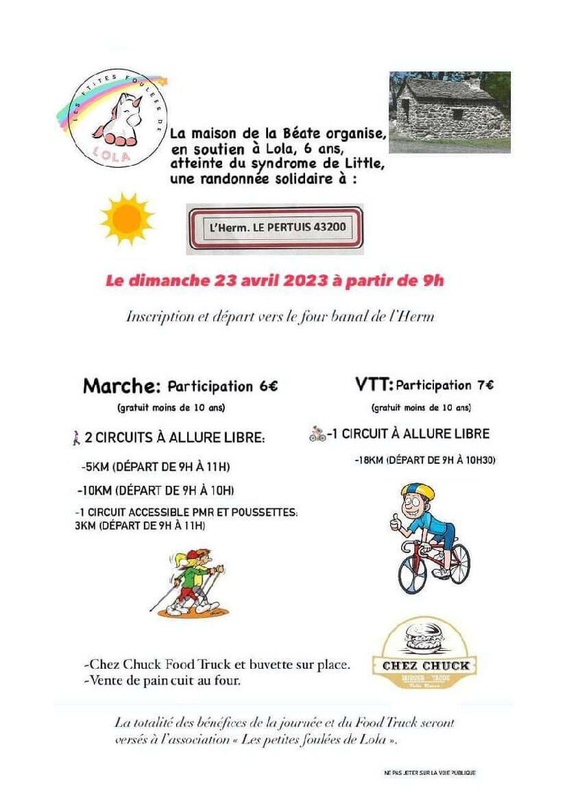 L'association de la Maison de la Béate de l'Herm organise en soutien à Lola, 6 ans atteint du syndrome de Little, une randonnée solidaire (marche ou VTT) à l'Herm le dimanche 23 avril 2023 à partir de 9h