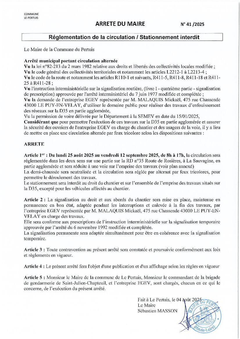 En raison de travaux dans le quartier de la Sauvagine/Lavoute la circulation et le stationnement seront temporairement interdits du lundi 25 août 2025 8h00 au vendredi 12 septembre 2025 17h00 sur une partie de la RD35 selon les besoins du chantier (voir plan).