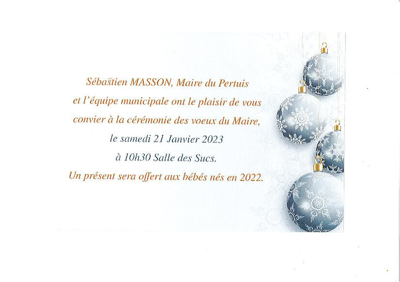L'équipe municipale vous convie à la cérémonie des vœux du Maire samedi 21 janvier 2023 à 10h30 à la Salle des Sucs