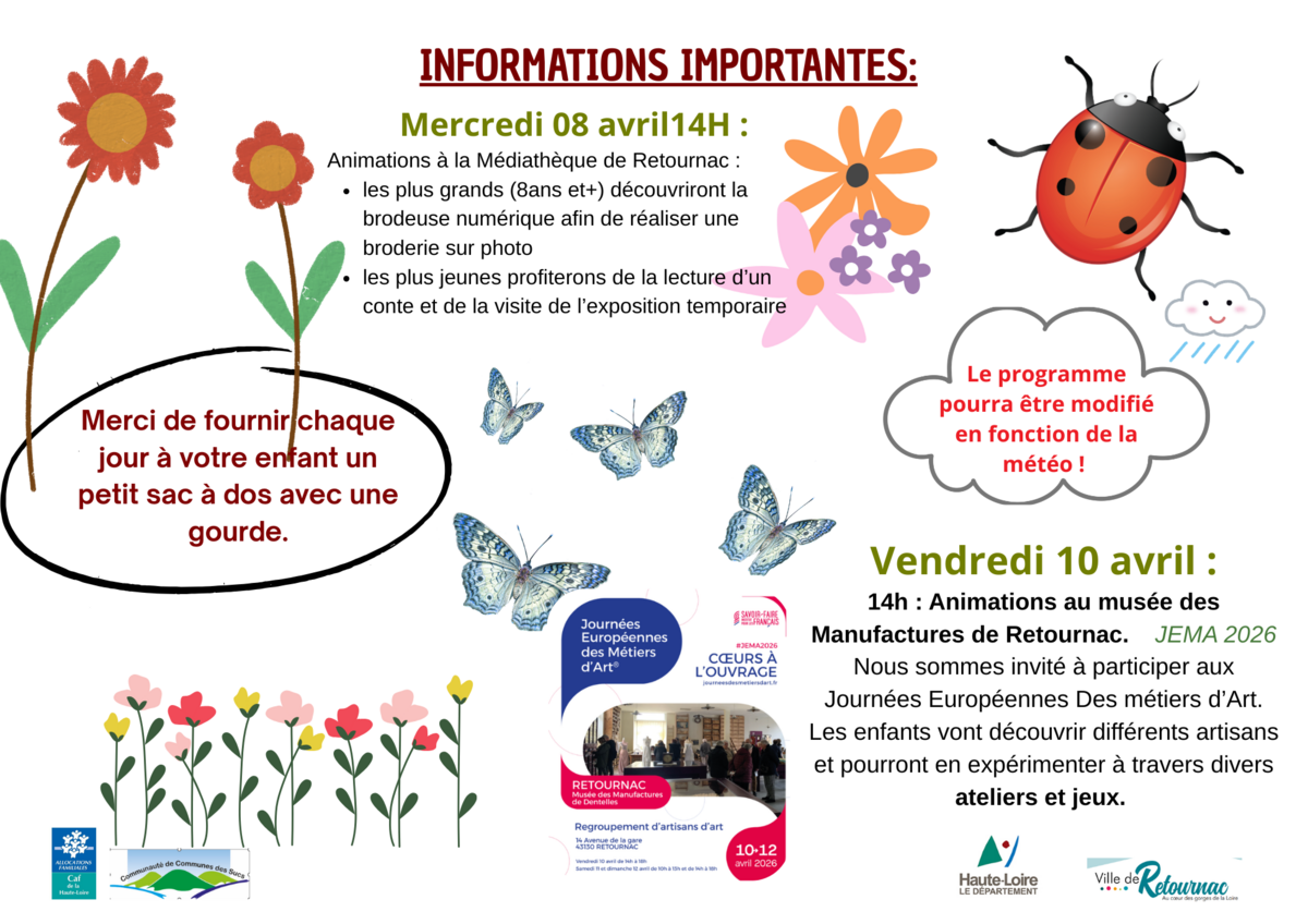 Les vacances de Printemps sont en approche ... et nous sommes heureux de vous présenter le programme qui sera proposé aux enfants durant cette quinzaine !!!