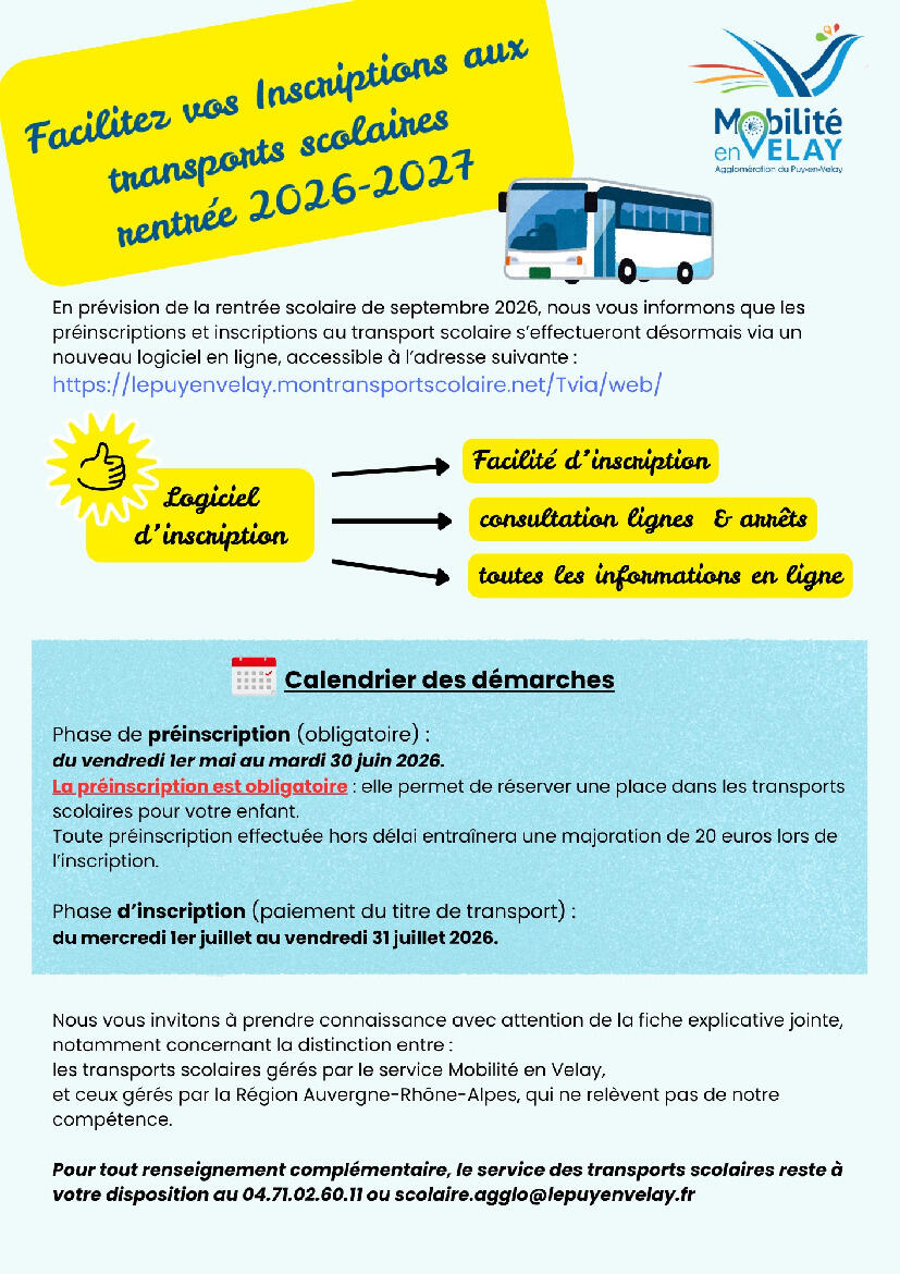 En prévision de la rentrée scolaire de septembre 2026, nous vous informons que les préinscriptions et inscriptions au transport scolaire de la Communauté d'agglomération du Puy-en-Velay s’effectueront désormais via un nouveau logiciel en ligne, accessible à l’adresse suivante :