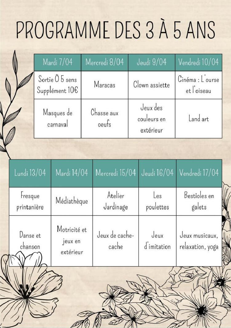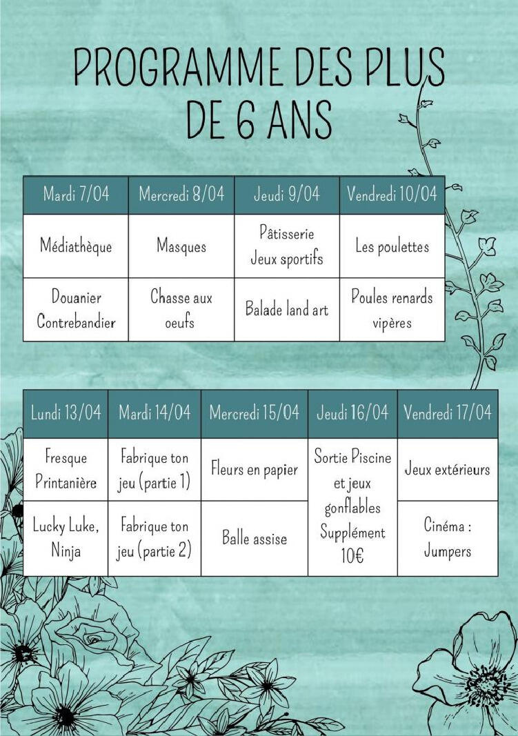 Ci-dessous le programme des vacances de printemps pour les vacances de Printemps du 7 avril au 17 avril