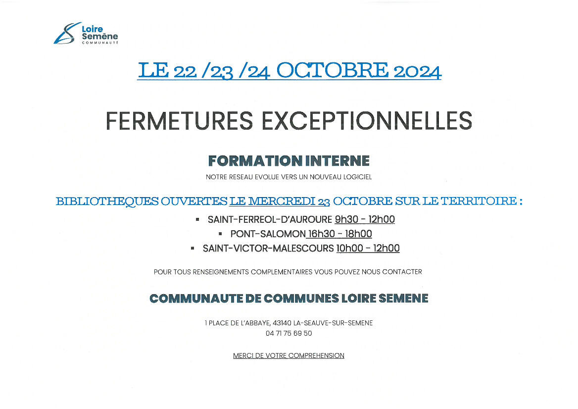 Fermetures exceptionnelles de la médiathèque 10/7/24 Fermeture exceptionnelle de la médiathèque les 22, 23 et 24 octobre.