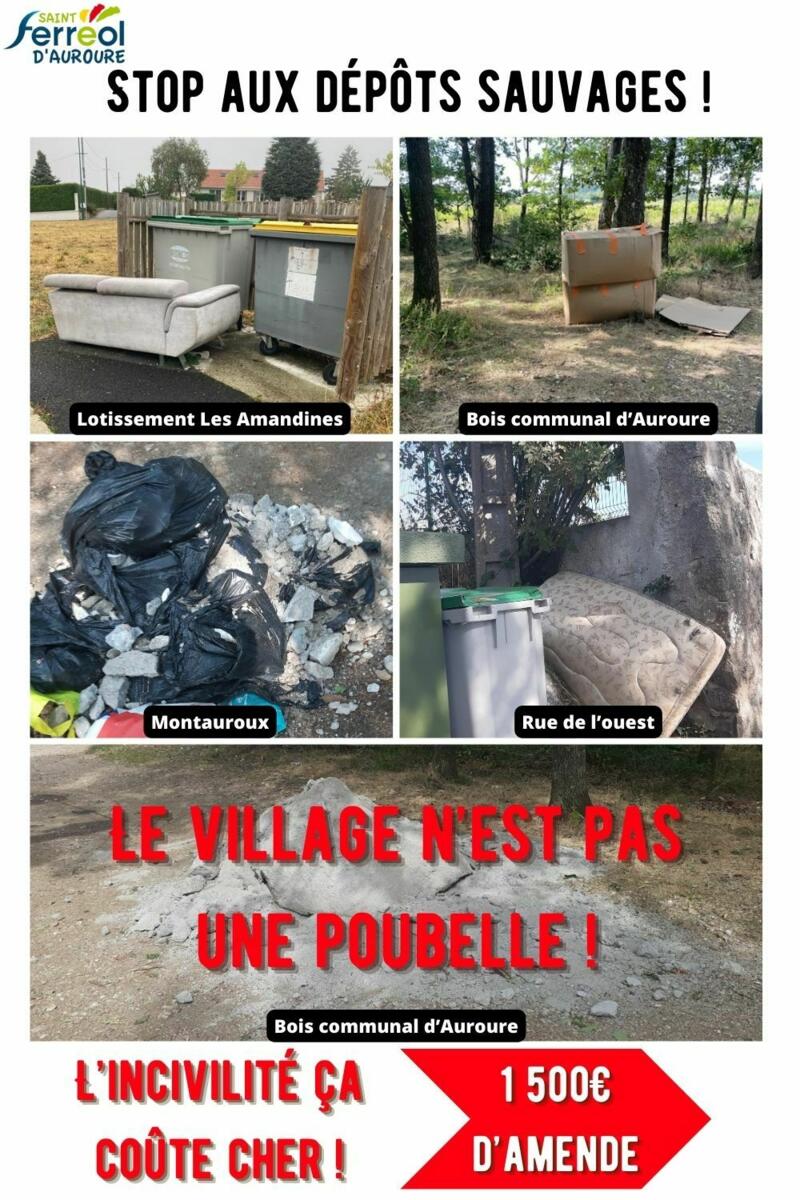 Pour rappel : est considĂ©rĂ© comme « dĂ©pĂŽt sauvage », le fait dâabandonner, de dĂ©poser, de jeter ou de dĂ©verser, en lieu public ou privĂ©, Ă l'exception des emplacements prĂ©vus Ă cet effet, Ă©paves de voitures, ordures, dĂ©chets, dĂ©jections, matĂ©riaux, liquides insalubres ou tout autre objet de quelque nature qu'il soit.