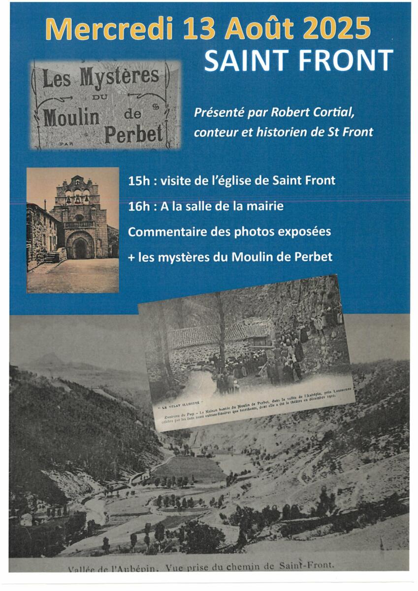 - 16h : Commentaire sur l'exposition de photos à la salle de la mairie et les mystères du Moulin de Perbet
