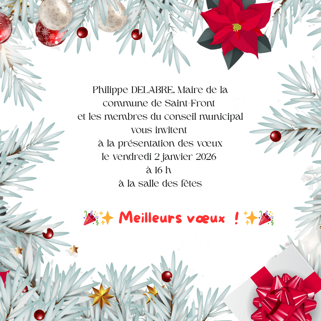Les voeux 2026 de la municipalité auront lieu vendredi 2 janvier 2026 à 16h à la salle des fêtes.