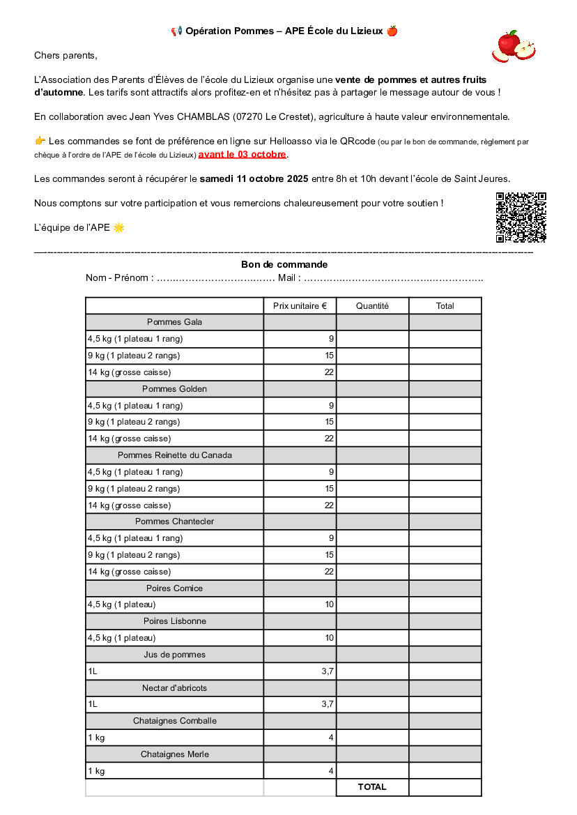 👉 Les commandes se font de préférence en ligne via ce lien helloasso (ou par le bon de commande, règlement par chèque à l’ordre de l’APE de l’école du Lizieux) avant le 03 octobre : https://www.helloasso.com/associations/association-des-parents-d-eleves-des-ecoles-du-lizieux/boutiques/operation-pommes