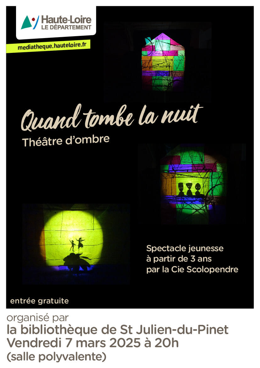 Le vendredi 7 mars à 20h à la salle polyvalente de Saint-Julien-du-Pinet, théâtre d'ombre "Quand tombe la nuit" .