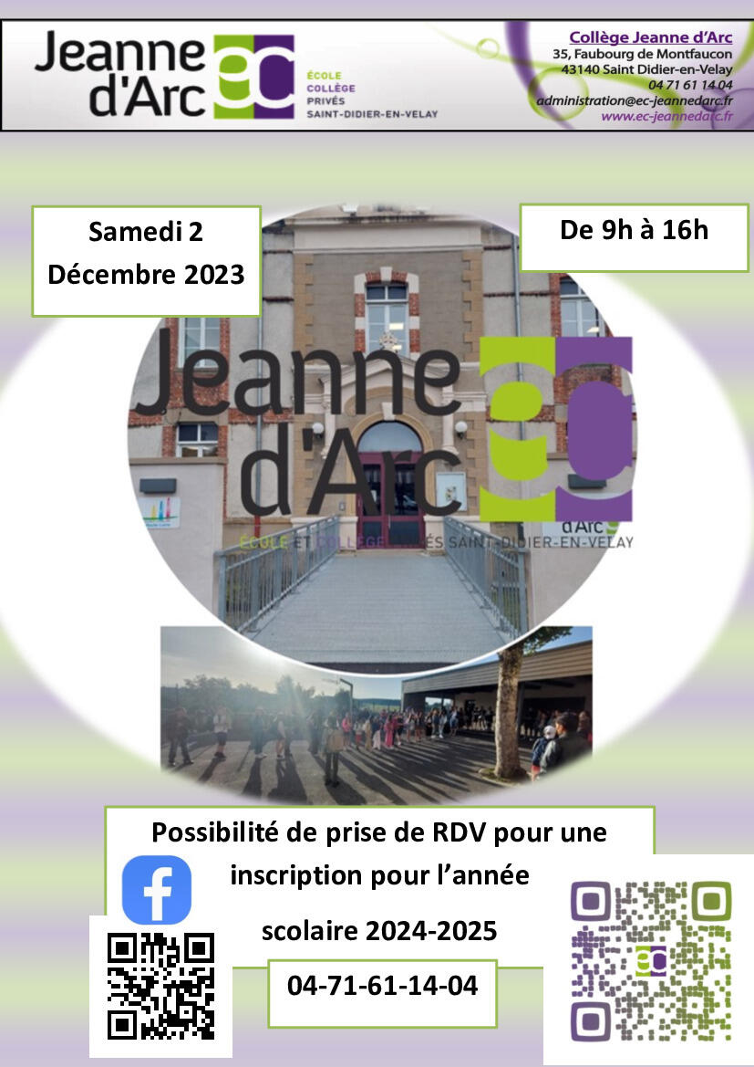 Inscriptions et renseignements au 04 71 61 14 04 ou par mail à l'adresse administration@ec-jeannedarc.fr