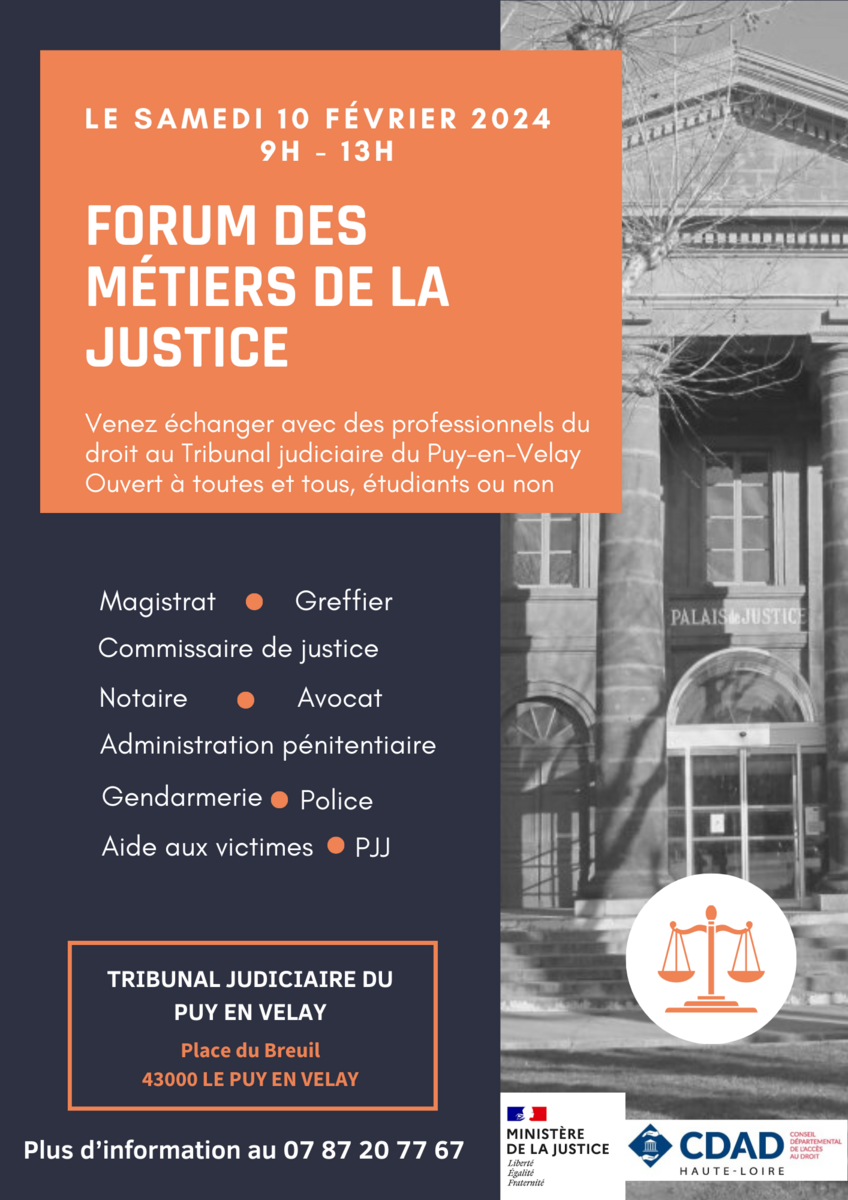 Le Conseil Départemental de l'Accès au Droit (CDAD), en partenariat avec le Tribunal Judiciaire du Puy en Velay, organise une Forum des Métiers de la Justice