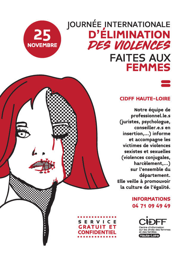 A l’occasion de cette journée, il est important de rappeler aux victimes de violences sexistes et à l'ensemble de la population, les lieux d’écoute, d’information et d'accompagnement que proposent le Centre d’Information des Droits des Femmes et des Familles de Haute-Loire (CIDFF).