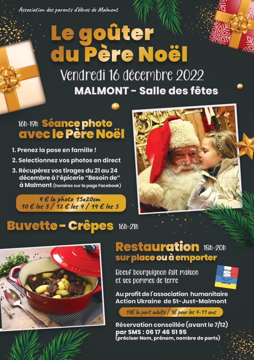 - 16h à 19h : Séance Photo📸 avec le Père Noël🎅 au profit de l'association des Parents d'élèves de l'école de Malmont 👦👧