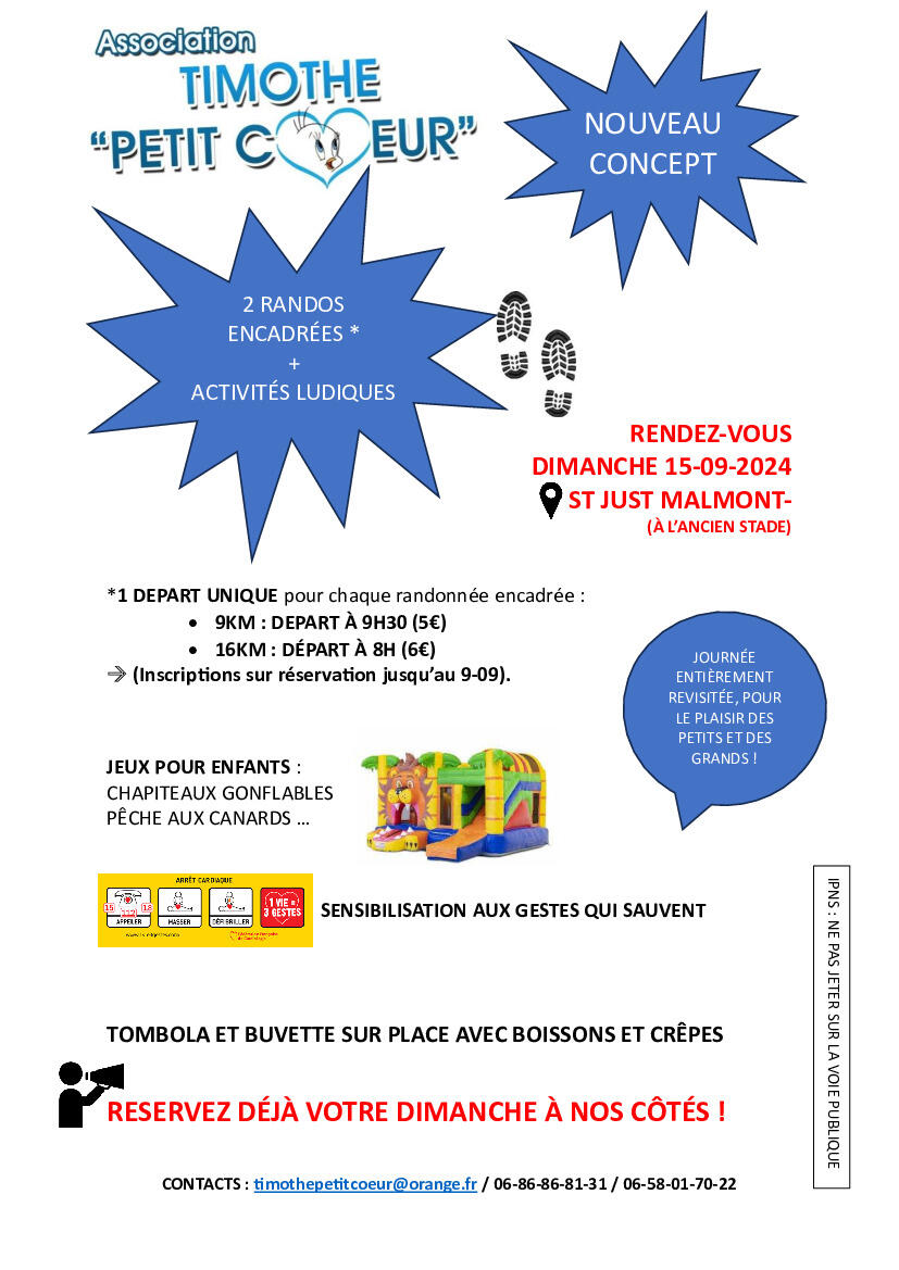 RENSEIGNEMENTS ET INSCRIPTIONS PAR TELEPHONE AU 06 86 86 81 31 / 06 58 01 70 22 OU PAR MAIL A timothepetitcoeur@orange.fr