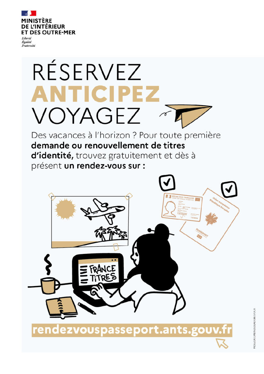 Des vacances à l'horizon ? Pour toute première demande ou renouvellement de titres d'identité, trouver gratuitement et dès à présent un rendez-vous sur rendezvouspasseport.ants.gouv.fr