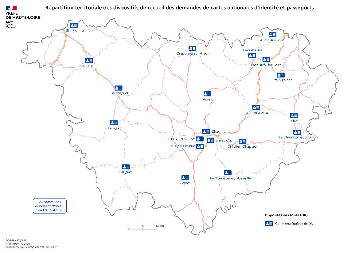 Retrouvez ci-joint la carte des communes de la Haute-Loire équipées du dispositif de recueil de demandes de cartes nationales d'identité et passeports.
