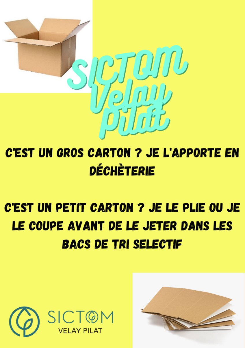 De ce fait, il est demandé à chacun d'apporter les gros cartons en déchèterie pour ne pas encombrer les poubelles jaunes. Les petits cartons pourront toutefois être collectés à condition de les plier ou de les couper.