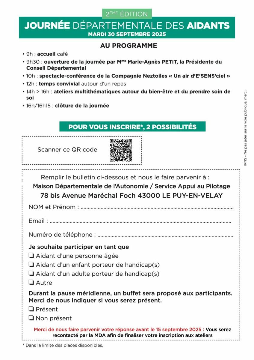 Nous avons le plaisir de vous faire parvenir le programme de la Journée Départementale des Aidants, 2ème édition, un événement essentiel dédié à la reconnaissance et au soutien des aidants auprès des personnes âgées ou des personnes en situation de handicap (enfant ou adulte) de notre département.