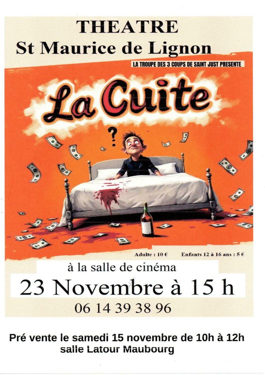 L'Association du GACS propose une séance théâtre le 23 novembre à 15H. La troupe "les 3 coups de St Just "présentera sa nouvelle pièce "La cuite".