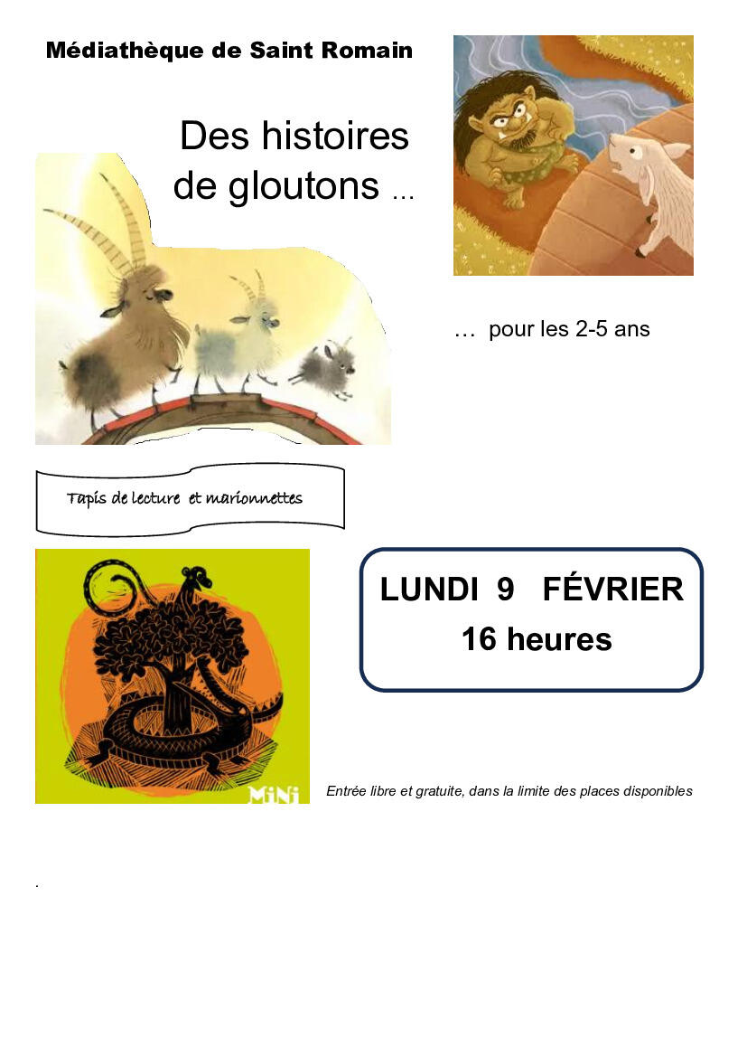 Les vacances commencent bien à la Médiathèque de St Romain Lachalm.... Venez avec vos enfants (2 à 5 ans), écouter des histoires de gloutons... le lundi 9 février à 16h