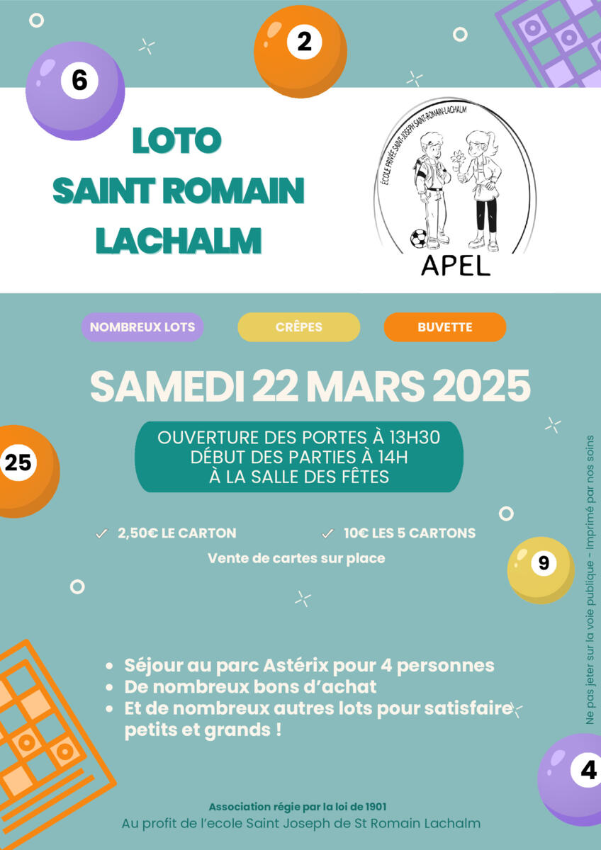 LOTO ECOLE PRIVEE 3/14/25 Samedi 22 mars à la salle des fêtes De nombreux lotos à gagner dont un séjour pour 4 personnes au parc Astérix