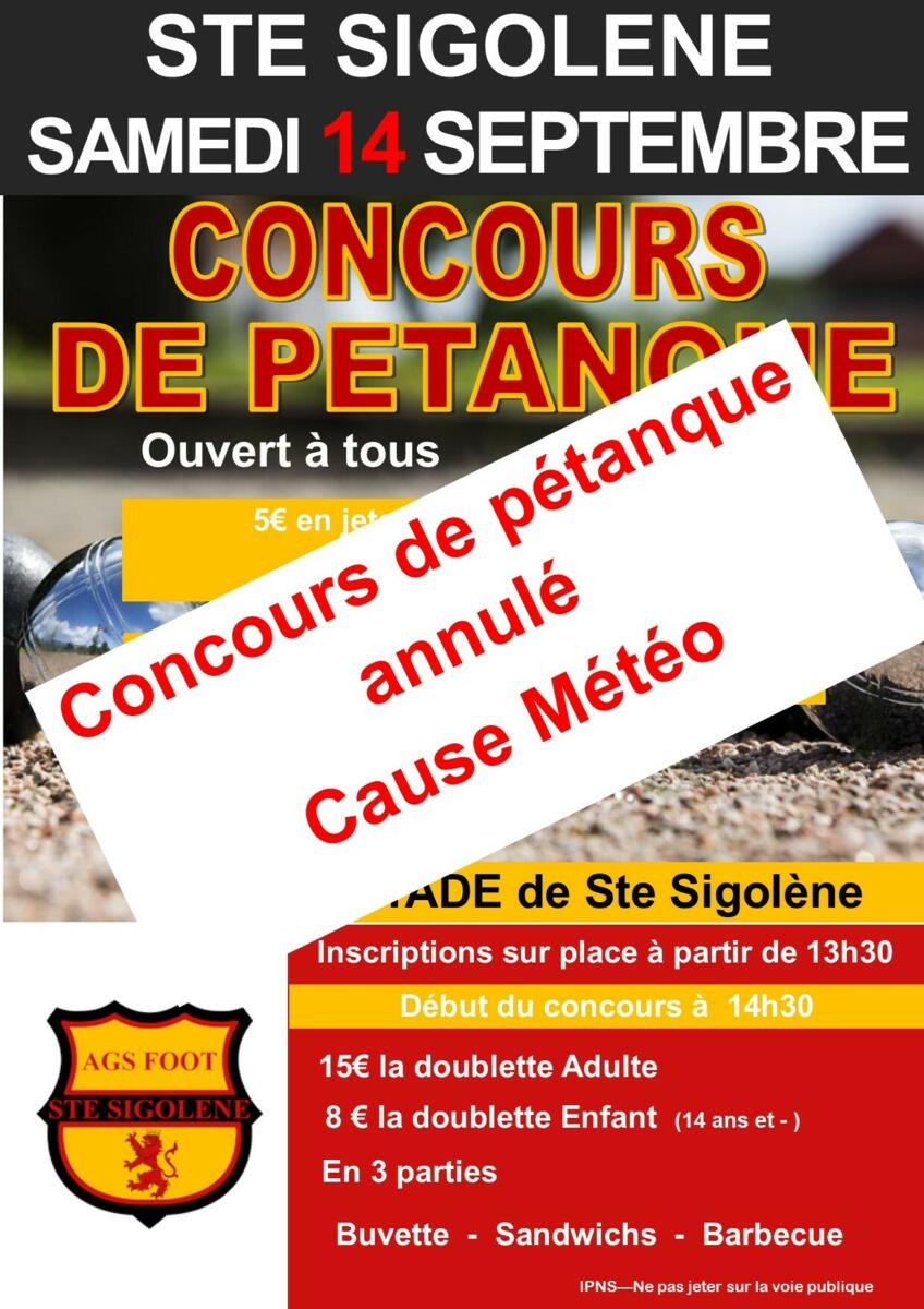 Annulation du Concours de pétanque organisé par l'AGS Foot 8/23/24 Cause METEO: Annulation du Concours de pétanque organisé par l'AGS Foot au complexe sportif