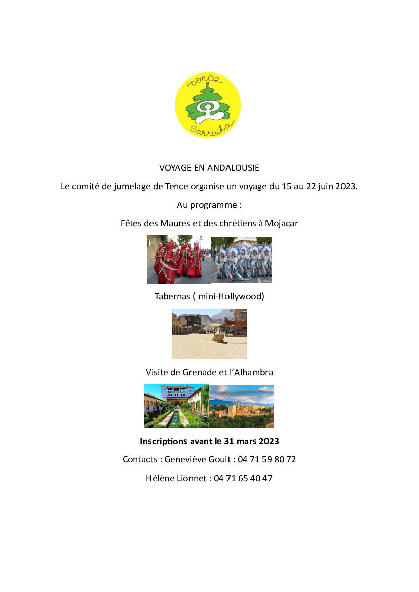 Le Comité de jumelage de Tence organise un voyage en Andalousie du 15 au 22 juin 2023.