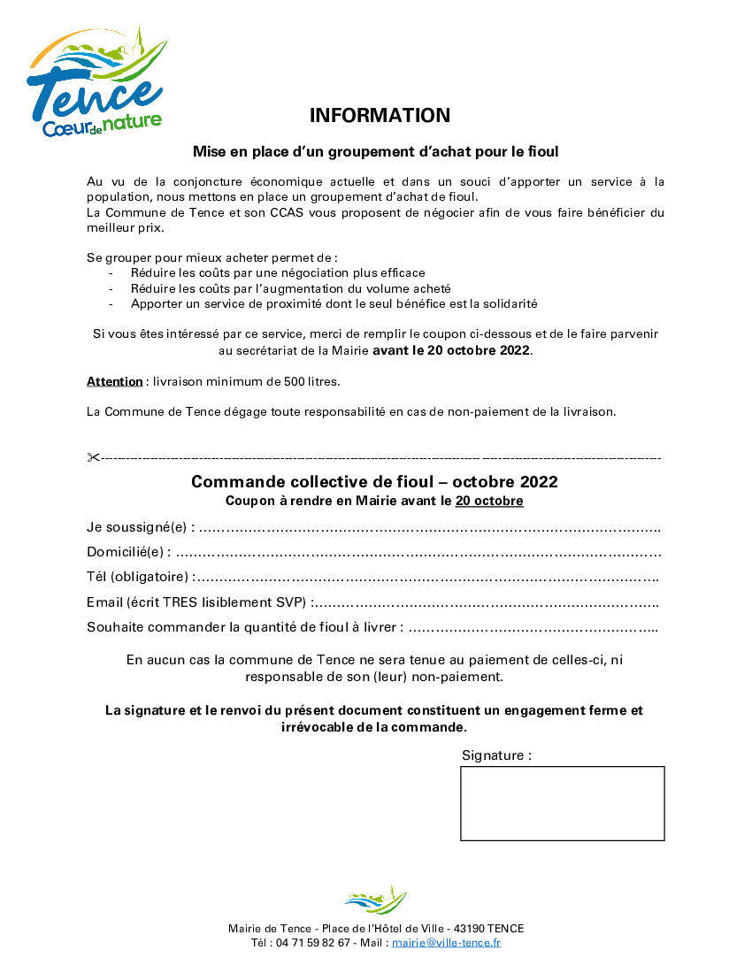 Face à la conjoncture économique actuelle et à la demande de ses habitants, la municipalité de Tence a décidé de mettre en place une commande groupée de fioul.