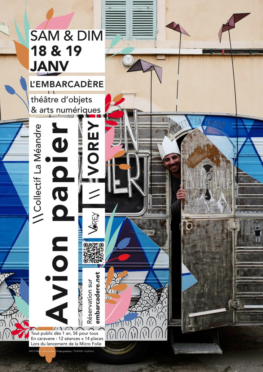 « Avion Papier » est un spectacle à la croisée des arts numériques, de la musique et du théâtre d’objets. À l’intérieur de ce micro-cinéma, on découvre un film d’animation, dont les personnages s’échappent et déambulent autour de vous. Il y a aussi des inventions mécaniques. Elles cliquettent là au creux de votre oreille. Et puis vous n’êtes pas seul dans ce voyage. Un musicien est votre hôte. Il vous accueille dans un paysage enfantin et onirique, et jongle avec divers instruments desquels se déversent de lumineuses mélodies.