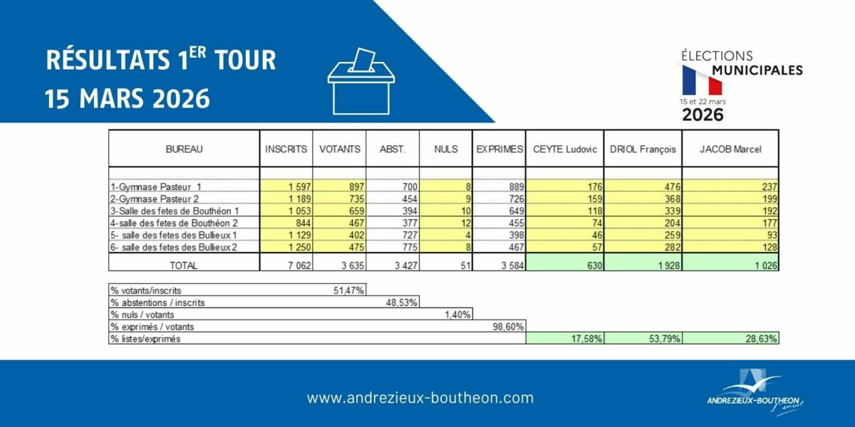 Résultats des élections municipales 2026 3/15/26 Les résultats des élections municipales à Andrézieux-Bouthéon.