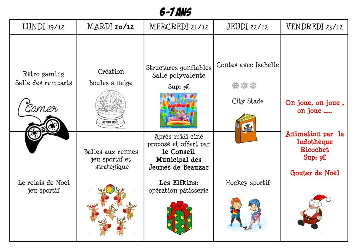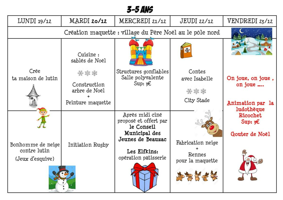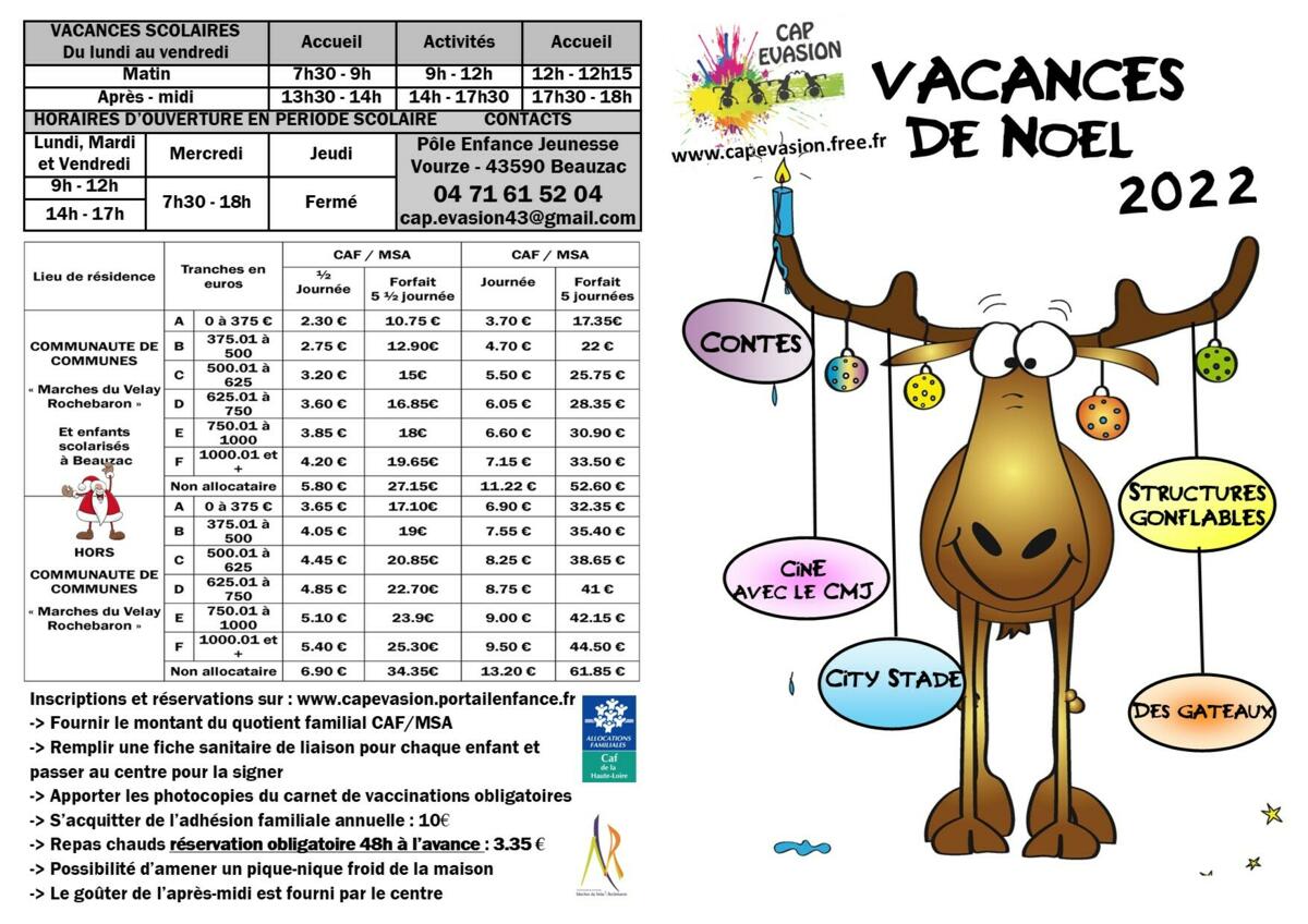 Bonjour ci-joint les programmes des vacances de Noël au centre de loisirs. N'oubliez pas d'inscrire vos enfants via notre portail familles : www.capevasion.portailenfance.fr et de mettre à jour votre profil, merci.