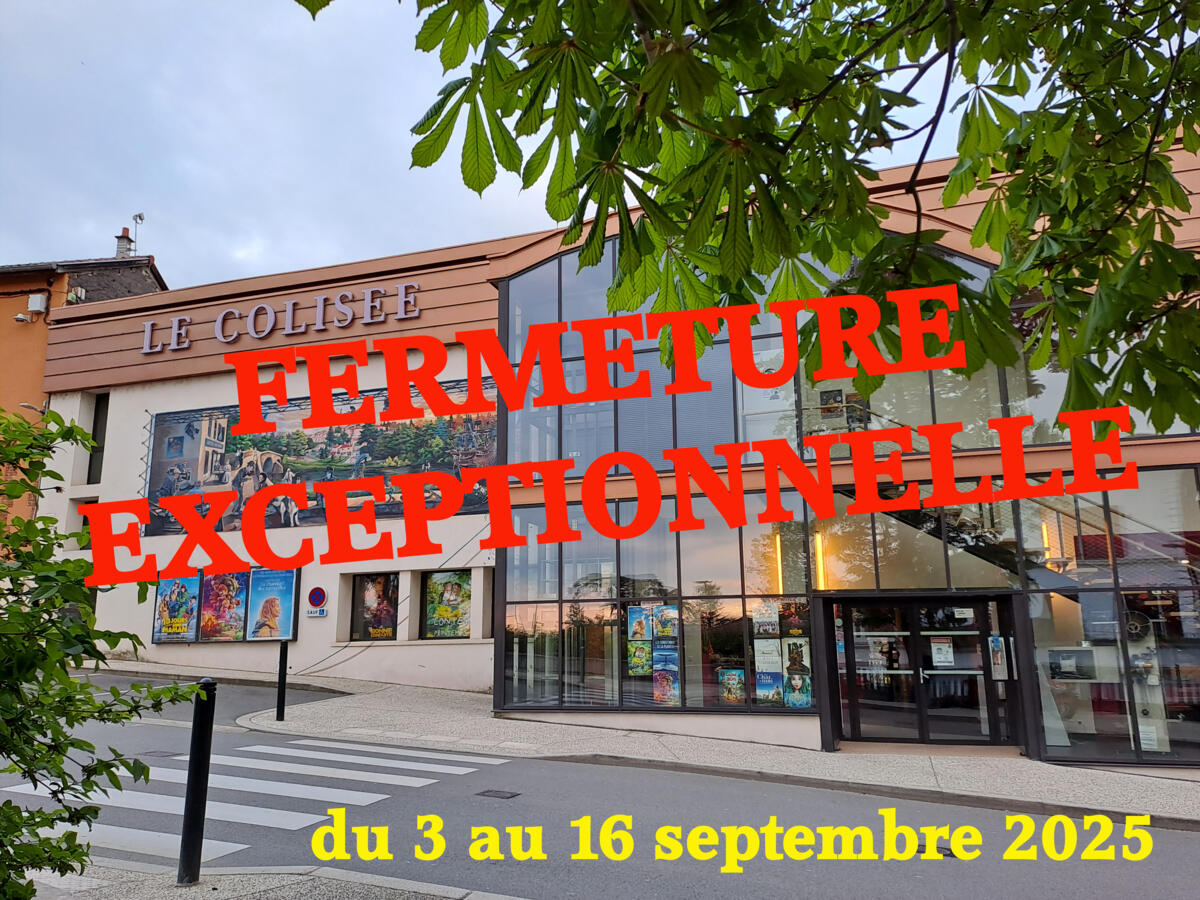 Votre cinéma Le Colisée sera fermé du 3 au 16 septembre 2025 inclus pour des travaux d’amélioration du confort. Nous mettons tout en œuvre pour vous accueillir dans les meilleures conditions possibles et avons hâte de vous retrouver à partir du 17 septembre dans un espace encore plus agréable.