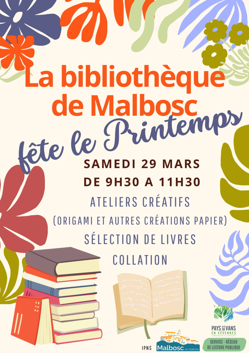 SAMEDI 29 : La bibliothèque fête le printemps ! Rendez-vous de 9h30 à 11h30 dans la salle de conseil municipal, entrée par la Cure. Ateliers créatifs, origami et autres créations papiers, sélection de livres et collations.