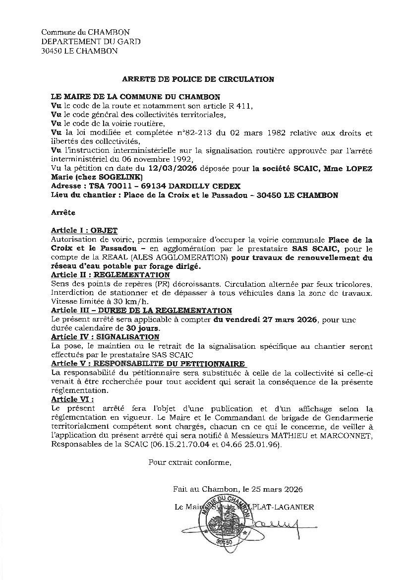 ARRETE DE POLICE DE VOIRIE - LE PASSADOU/PLACE DE LA CROIX 25/3/26 Arrêté à compter du vendredi 27 mars 2026
