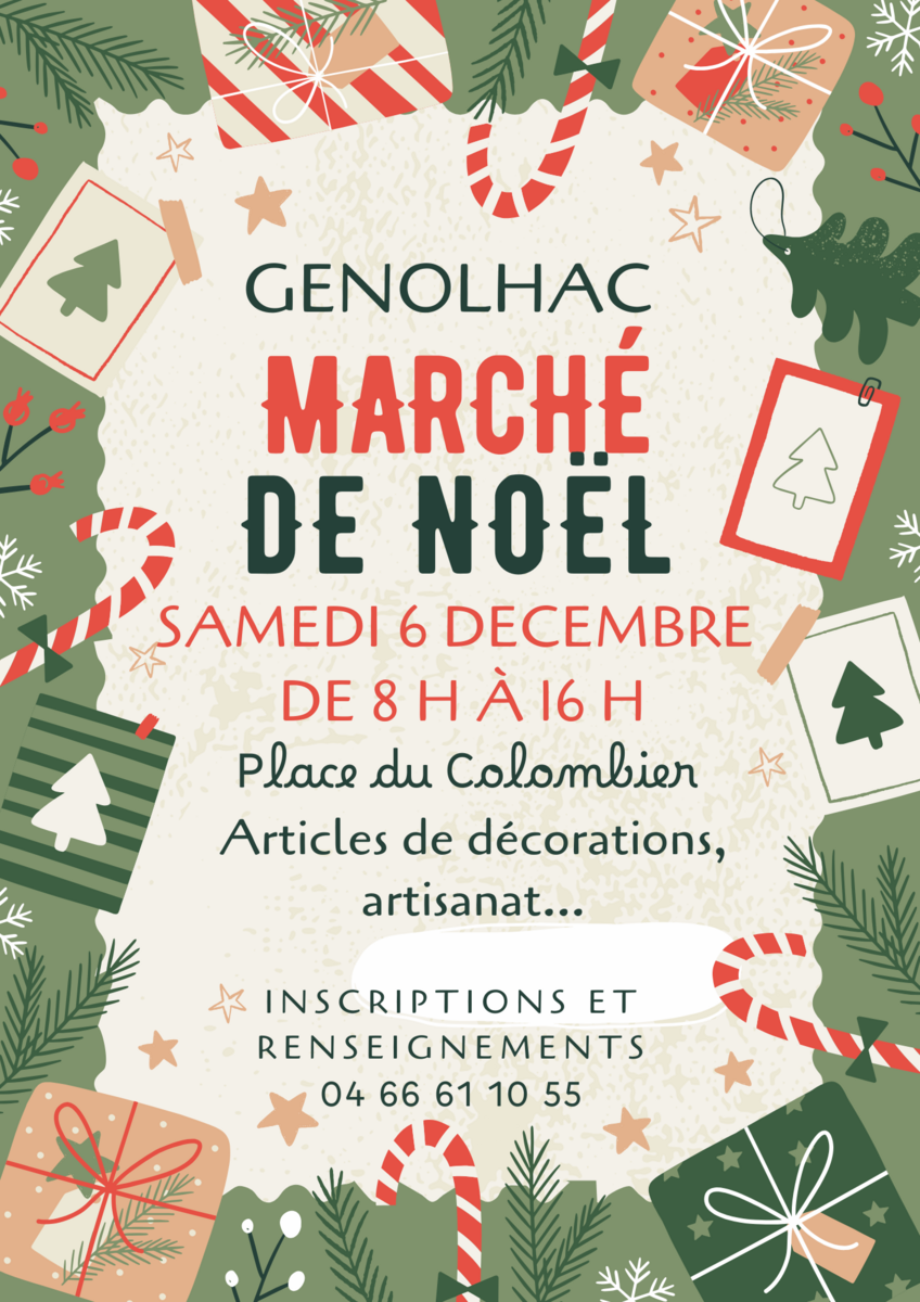 MARCHÉ DE NOEL 13/11/25 Le marché de Noël aura lieu le samedi 6 décembre place du Colombier. Inscriptions en mairie : 04 66 61 10 55