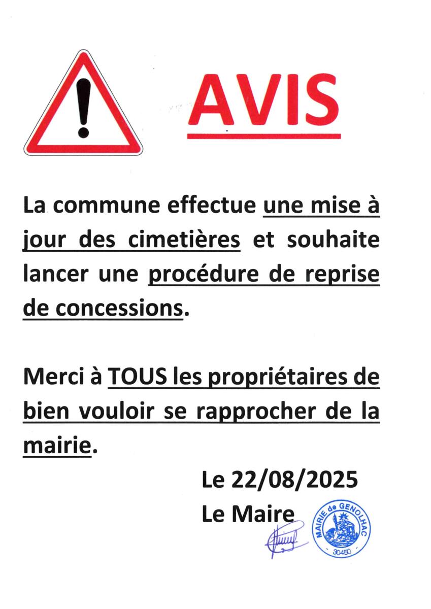 Merci à tous les propriétaires (concessions perpétuelles et trentenaires) de bien vouloir se rapprocher de la mairie.