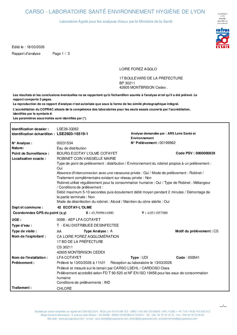 💧 Analyse de l’eau potable – Résultats du 13 mars 2026 💧