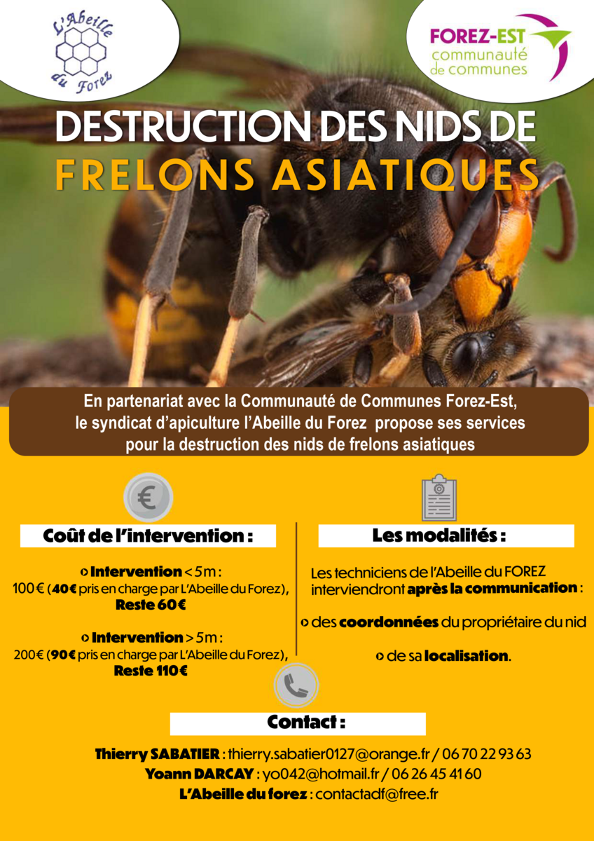 Le syndicat d’apiculture L’Abeille du Forez, en partenariat avec la Communauté de Communes Forez-Est, propose un service de destruction des nids de frelons asiatiques.