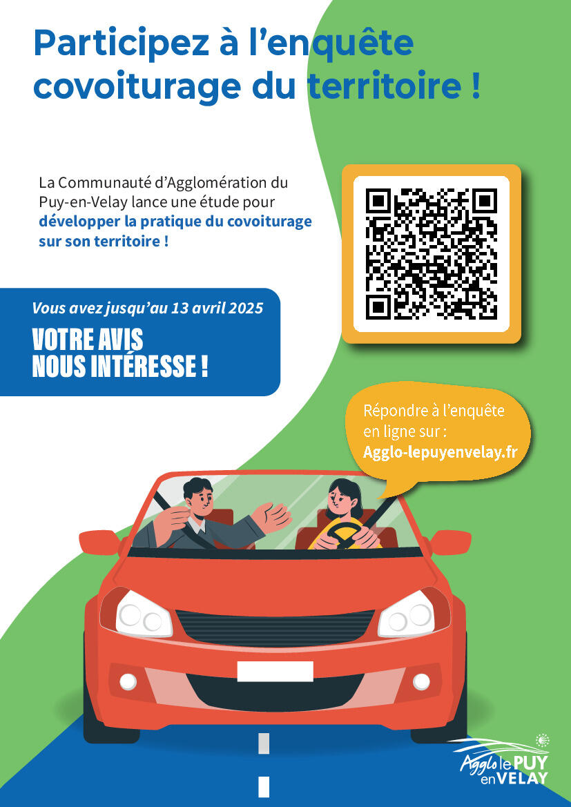 Le service mobilité de la Communauté d’agglomération du Puy-en-Velay lance une grande enquête au sein du territoire afin de prendre le pouls de ses concitoyens sur leurs attentes en matière de covoiturage. Celle-ci s’inscrit dans le cadre de l’élaboration d’un schéma directeur covoiturage, et permettra ainsi de définir les lieux où la population est désireuse de bénéficier d’aires de covoiturages.