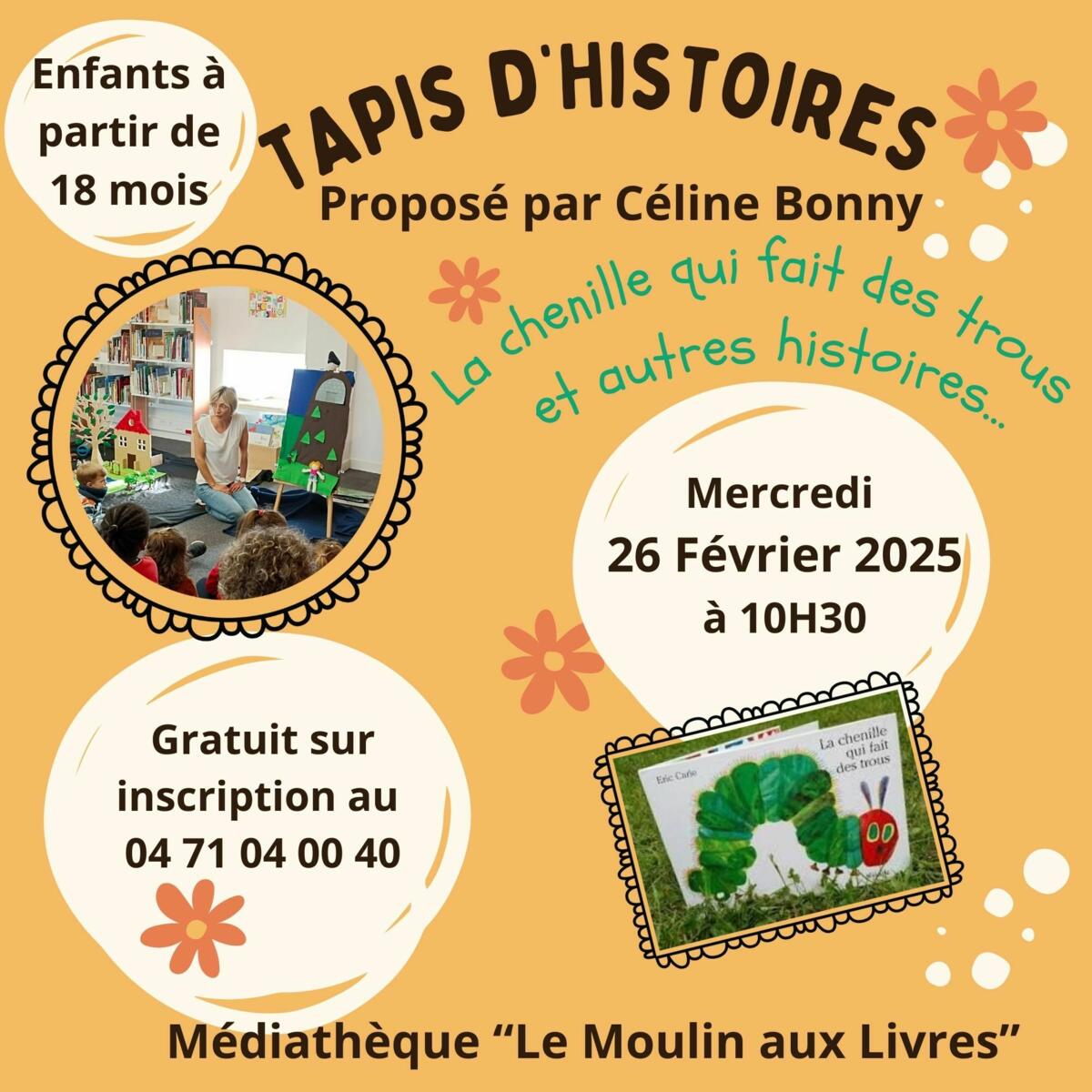Raconte tapis avec Céline Bonny le mercredi 26 février à 10H30 : La chenille qui fait des trous et autres histoires.