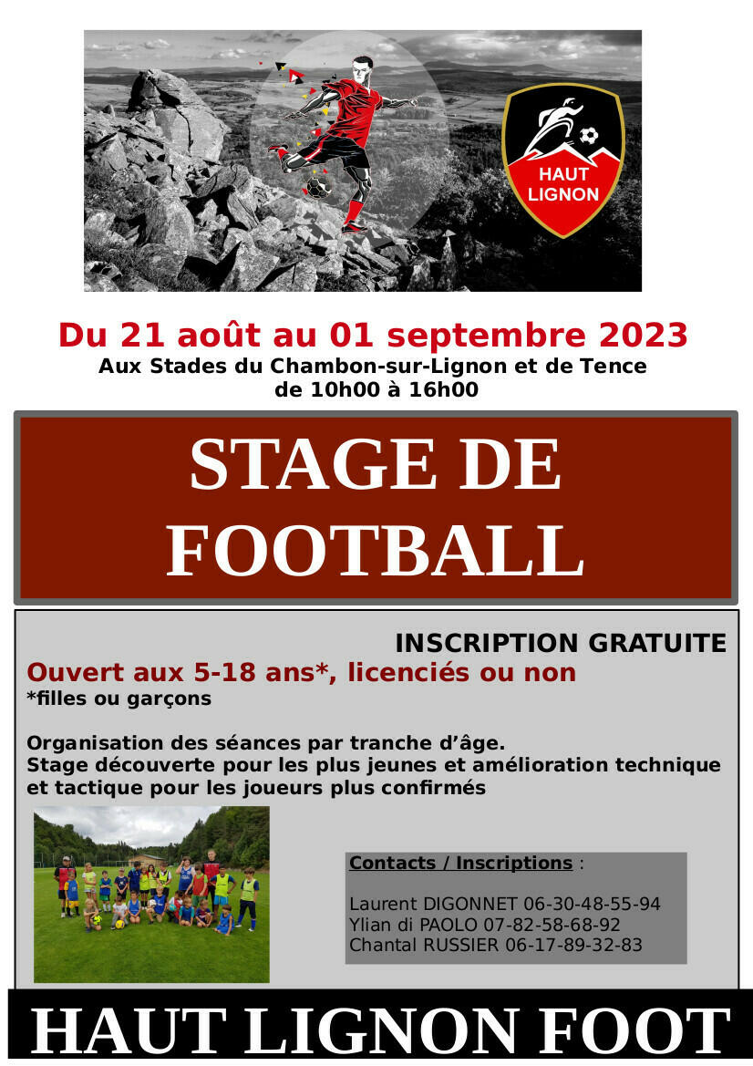 Haut Lignon Foot organise un stage de football du 21 août au 01 septembre, ouvert aux jeunes de 5 à 18 ans, licenciés ou non, garçons ou filles.