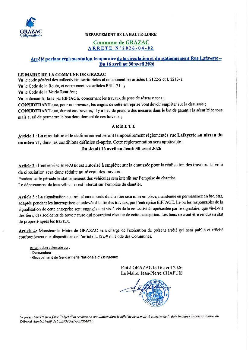 Veuillez trouver ci-joint un arrêté de circulation et stationnement pour des travaux Rue LAFAYETTE au niveau du numéro 71 commune de Grazac du jeudi 16 au jeudi 30 avril 2026.
