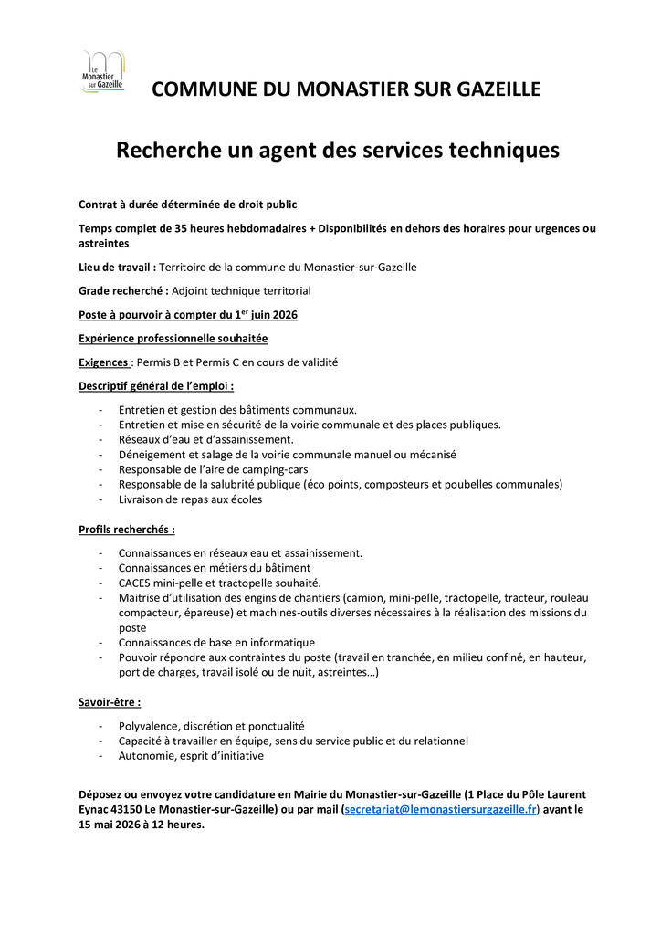 / Offre d'emploi : agent des services techniques