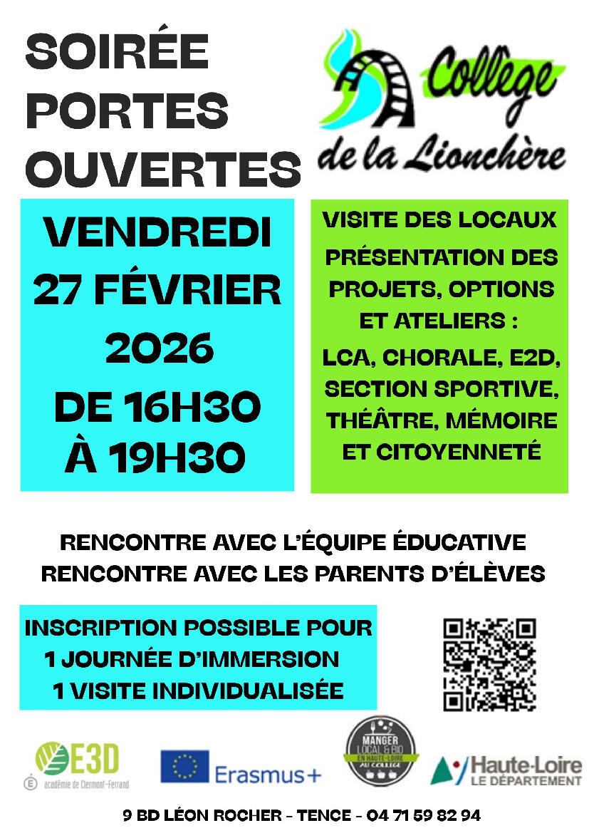 L'équipe du collège public de La Lionchère organise sa soirée portes ouvertes le Vendredi 27 février 2026 de 16h30 à 19h30 :