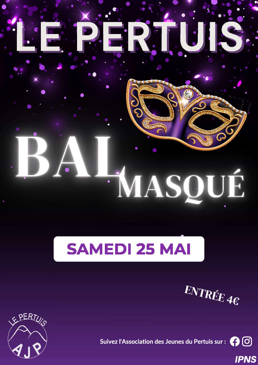Bal des Jeunes du Pertuis samedi 25/05 25/4/24 Bal MASQUÉ des Jeunes du Pertuis samedi 25 mai Entrée 4€